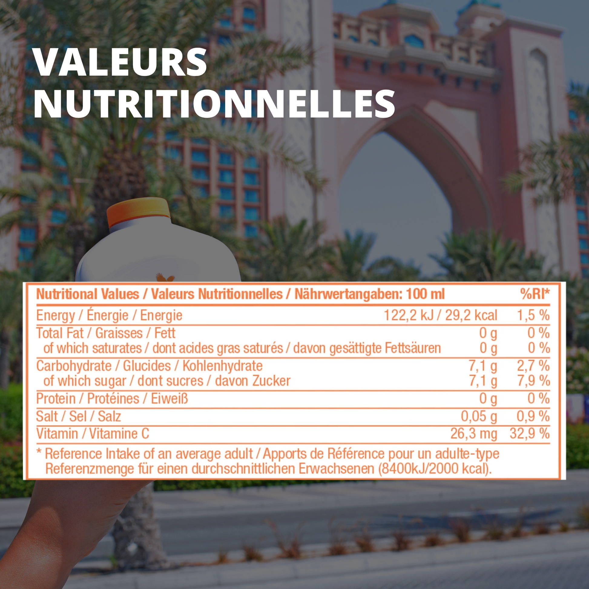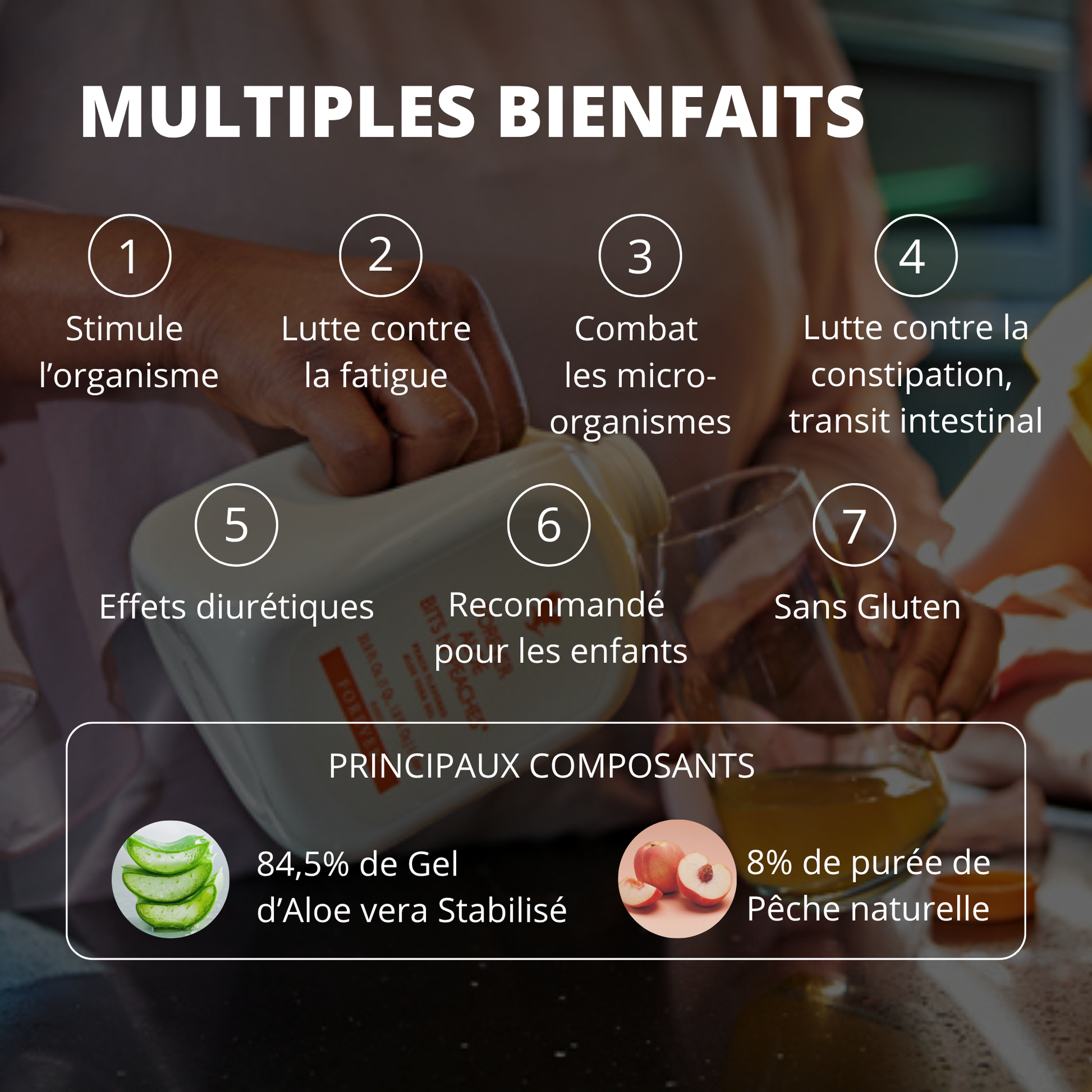 Gel d’Aloe vera stabilisé [gel d’Aloe vera (84,5%), vitamine C (acide ascorbique), antioxydant (acide ascorbique), acidifiant (acide citrique)], purée de pêche naturelle (8%), fructose, jus concentré de raisin blanc naturel, arôme pêche.