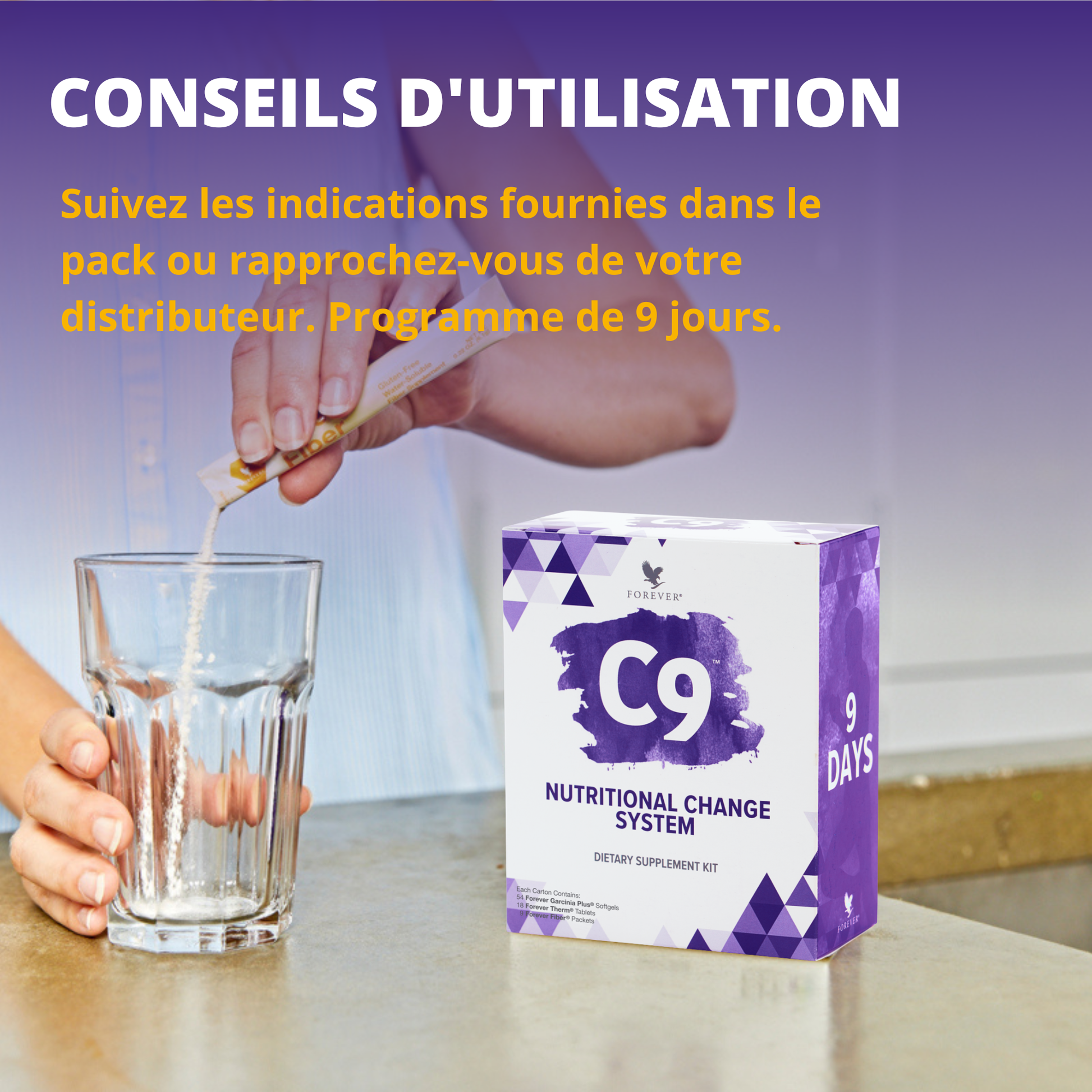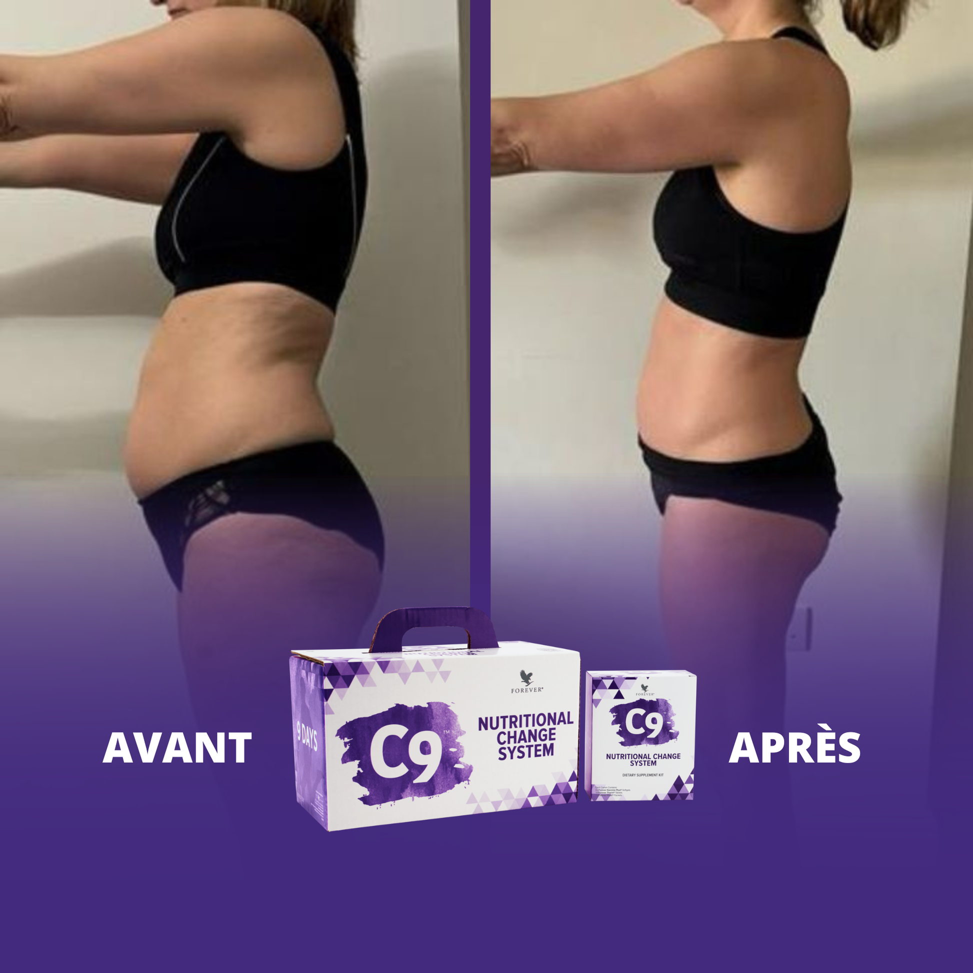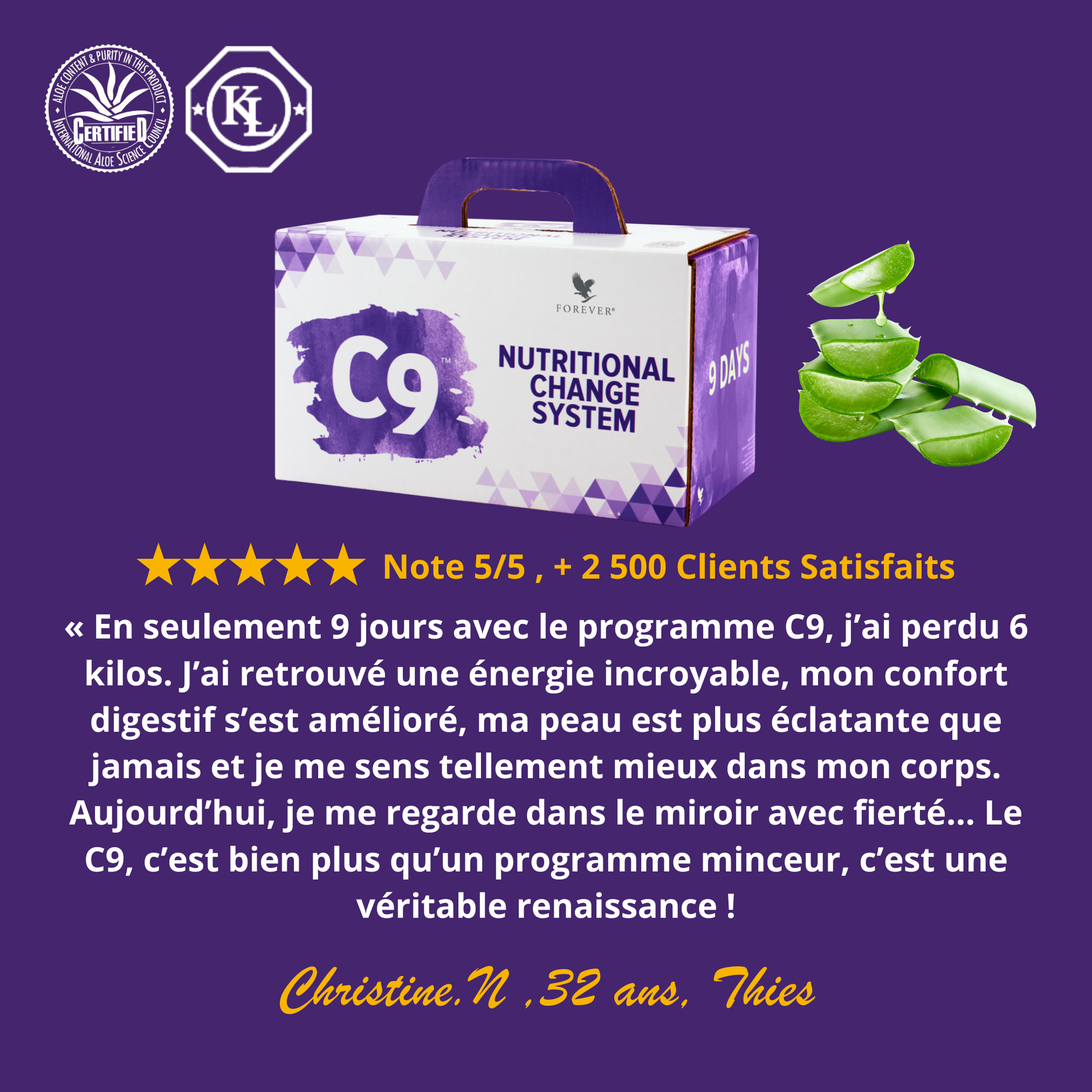 Le C9 est la première phase du programme Forever F.I.T., programme Minceur et Fitness. Il s’effectue sur 9 JOURS pour purifier son organisme en éliminant les toxines. Les résultats apparaissent dès les premiers jours : perte de poids, sensation de légèreté et énergie retrouvée.