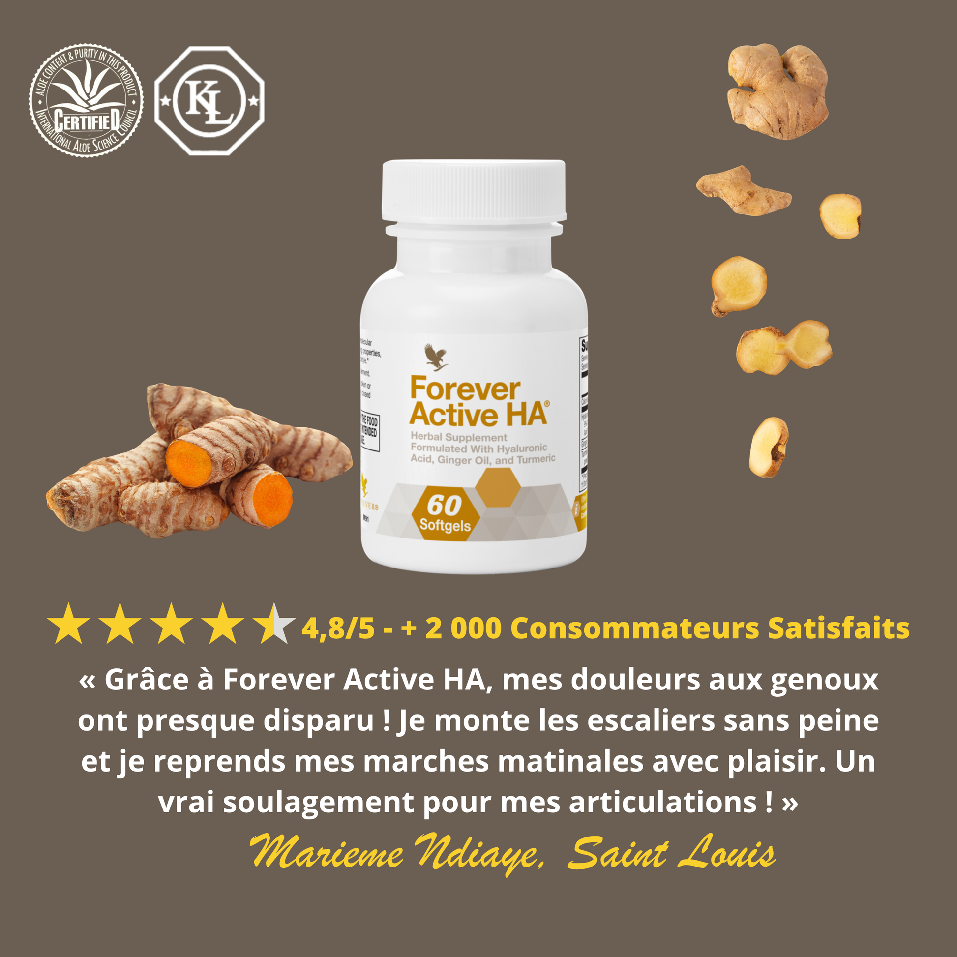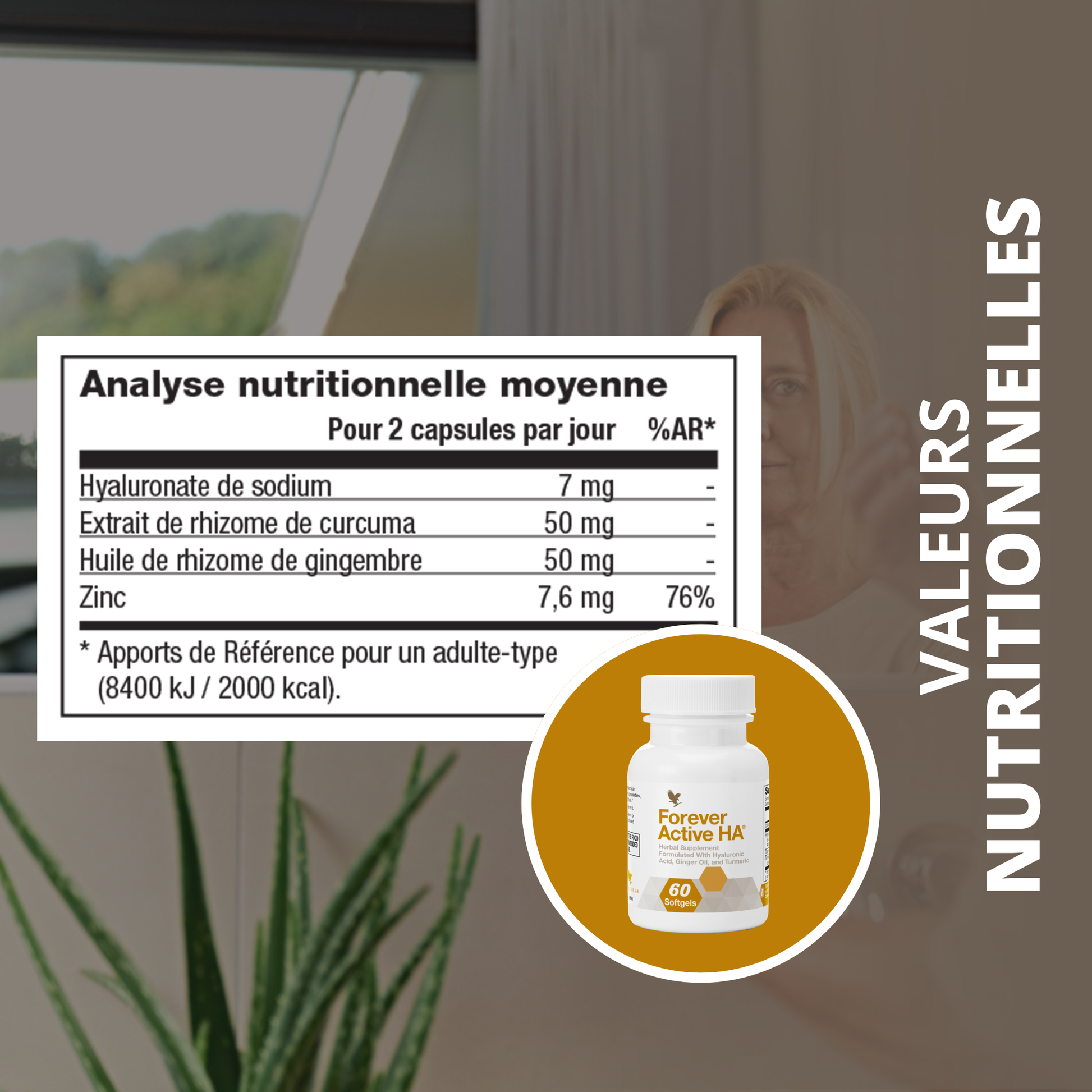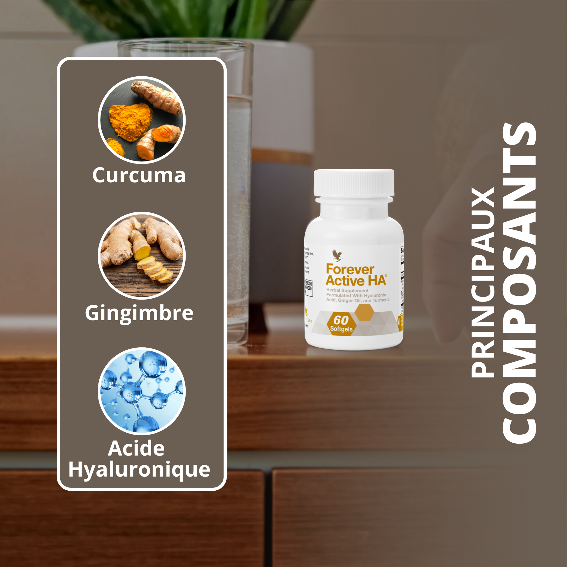 Forever active H A est un complément alimentaire de notre gamme à base d’acide hyaluronique, d’huile de gingembre, de safran d’Inde ( curcuma ) et de zinc. L’acide hyaluronique (HA) qui est produit par l’organisme se trouve naturellement dans la peau, les yeux et dans le cartilage des articulations dont il assure la flexibilité.