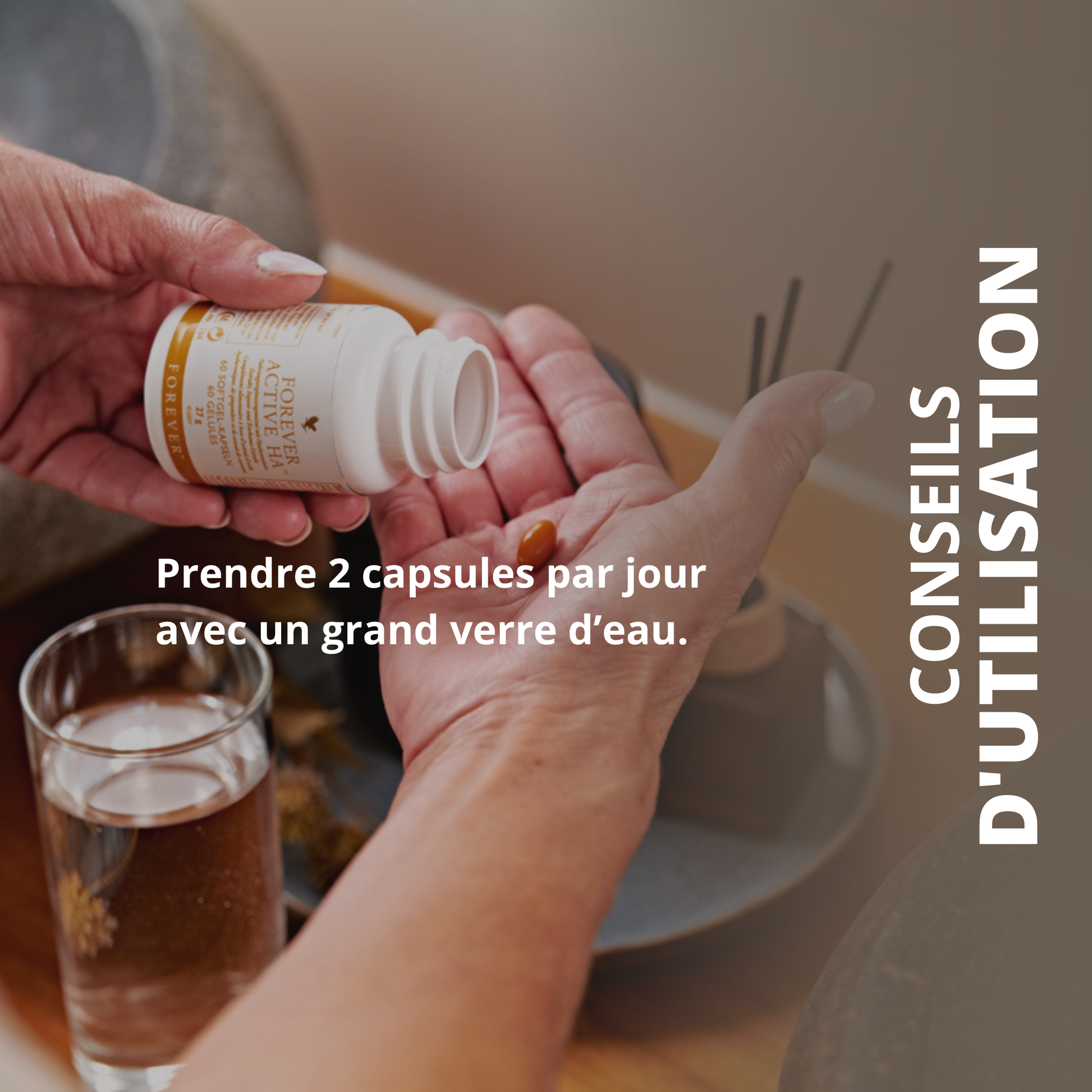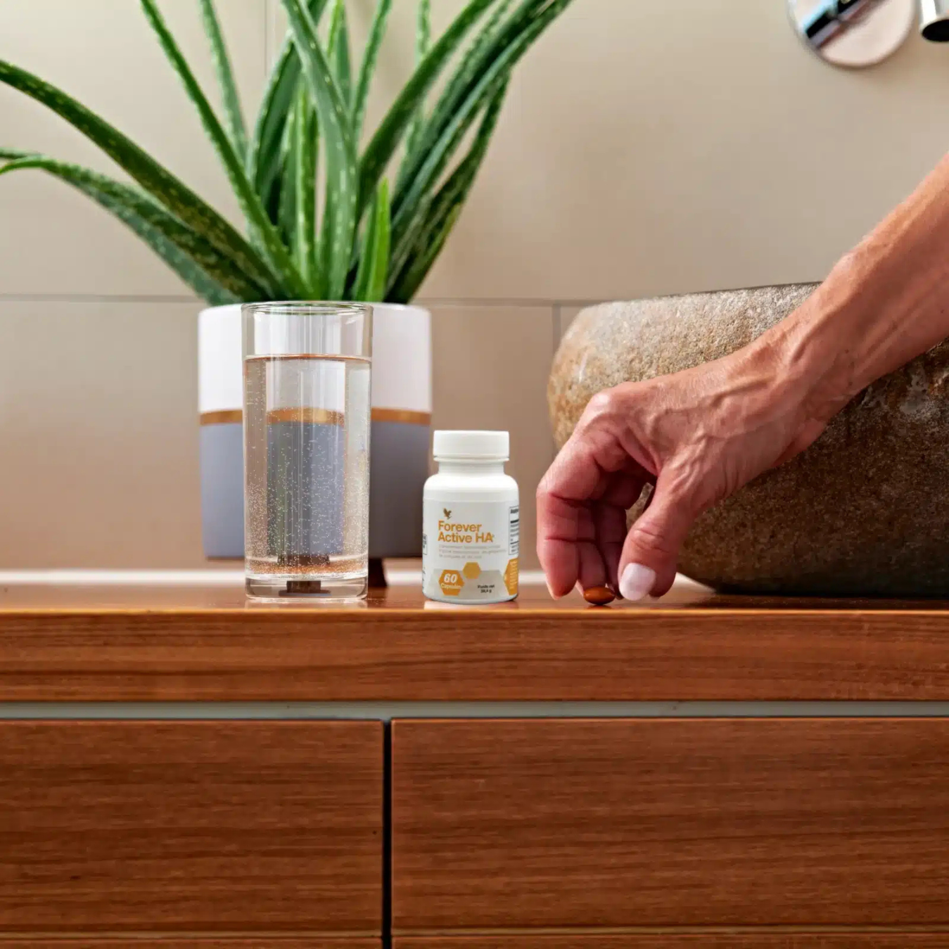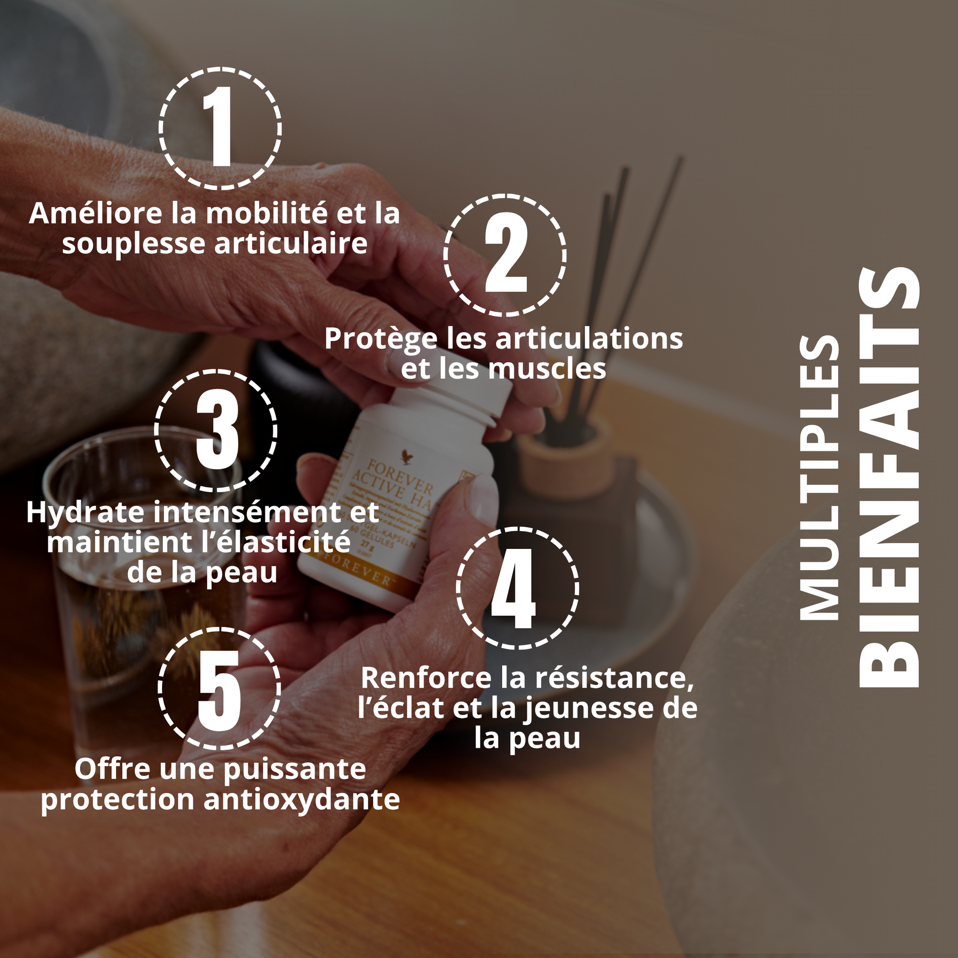 Forever active H A est un complément alimentaire de notre gamme à base d’acide hyaluronique, d’huile de gingembre, de safran d’Inde ( curcuma ) et de zinc. L’acide hyaluronique (HA) qui est produit par l’organisme se trouve naturellement dans la peau, les yeux et dans le cartilage des articulations dont il assure la flexibilité.