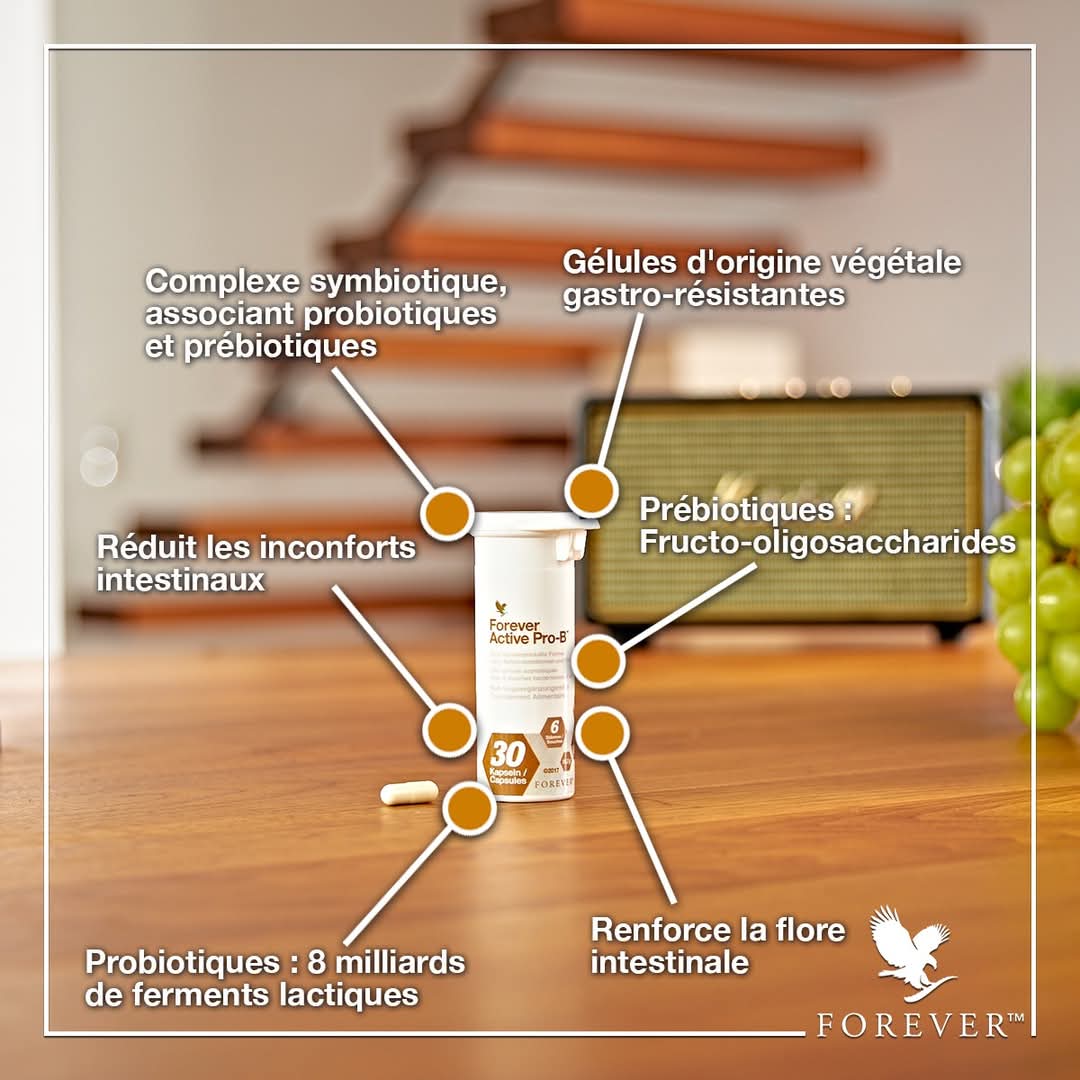 Active pro-B Forever, est un produit qui permet de garder le bon équilibre de la flore intestinale qui favorise la digestion. Cette flore intestinale est composée de plusieurs milliards de bactéries. Toutes ces bactéries participent au bon fonctionnement de l’organisme. Lorsque la flore intestinale est déséquilibrée, l’inconfort intestinal et la perte d’énergie se font ressentir. l’action du microbiote intestinal sur le stress, l’anxiété et la dépression est très importante et a une influence négative ou positive sur notre bien-être et notre santé.