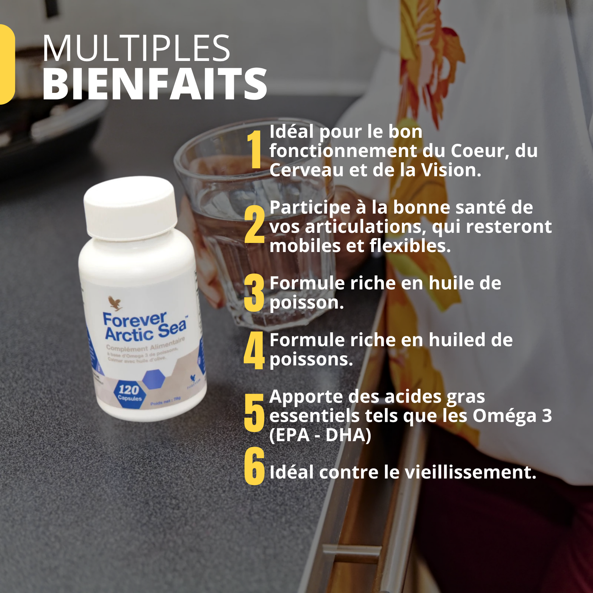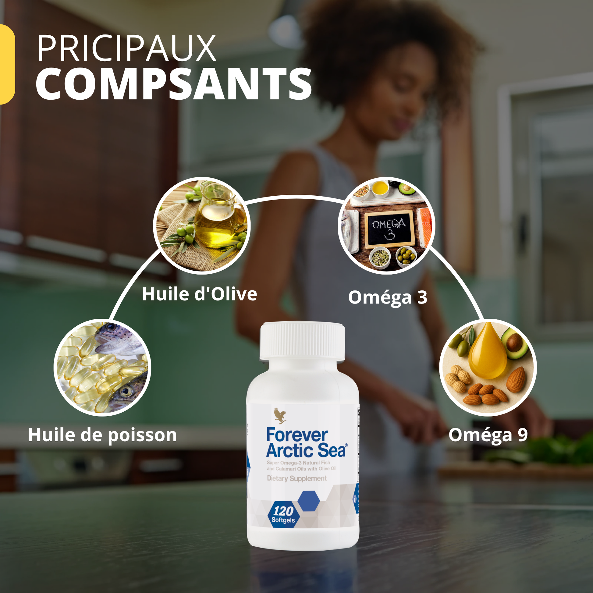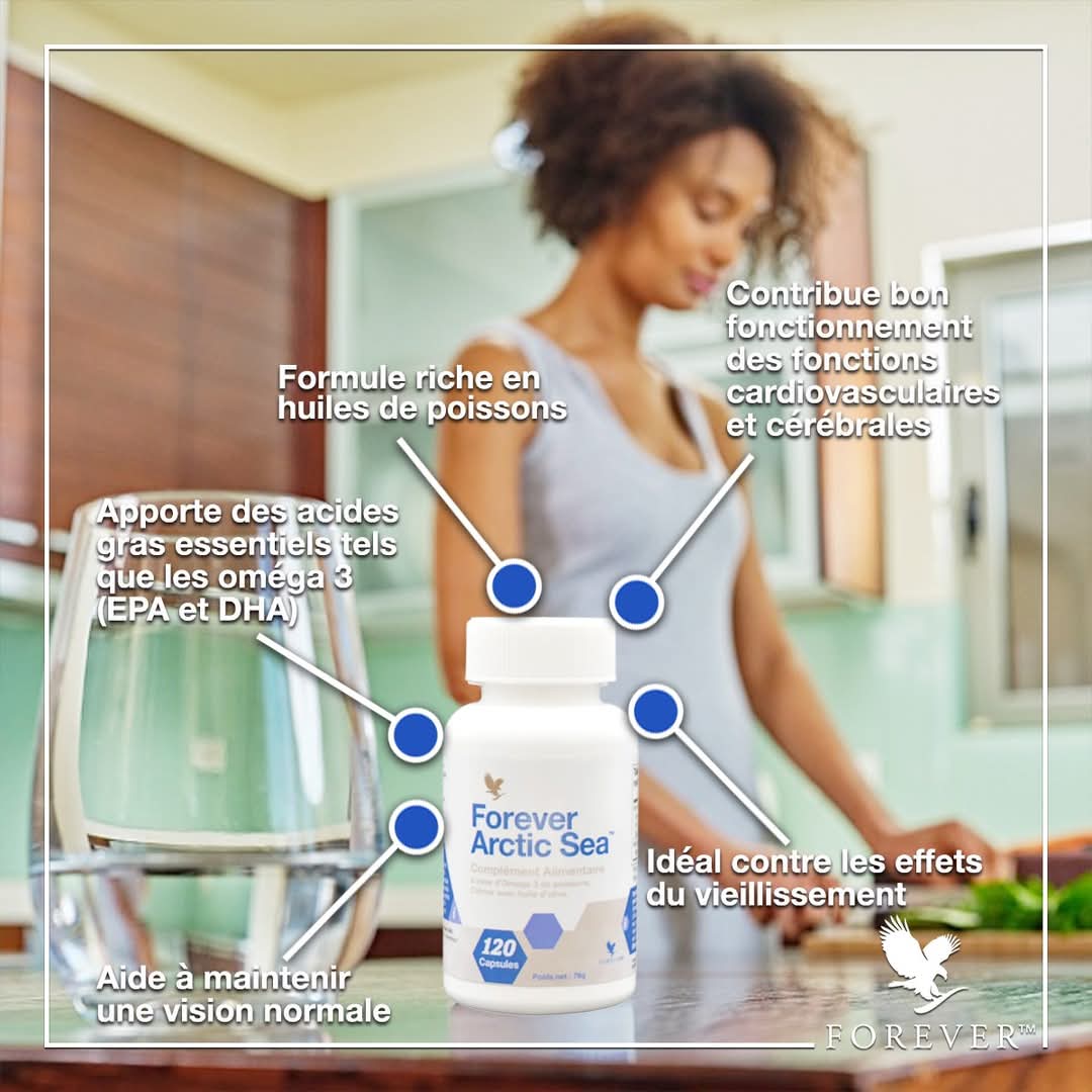 Ce complément alimentaire à base d’huile de poisons (saumon,sardine, cabillau)contient des acides gras insaturés, des oméga-3 et oméga 9, dont de l’EPA (acide eicosapentaénoïque) et du DHA (acide docosahexaénoïque) présents dans ces huiles de poissons « le bon gras » Arctic-Sea Forever contient également des huiles de calamar et de l’huile d’olive. Ces acides gras sont dits « essentiels » car l’organisme ne peut pas les synthétiser lui-même. L’apport et l’action de ces nutriments est très important, car souvent, ils manquent dans notre régime alimentaire quotidien. Ce sont des éléments que l’on retrouve dans l’alimentation Méditerranéenne ( ou régime Crétois ) qui donnent une longévité exceptionnelle aux habitants de cette région. Ils contribuent au fonctionnement optimal du cerveau, du cœur, du système cardiovasculaire et du taux de cholestérol normal et également ils aident à maintenir une vision normale. Il est possible d’associer la prise d’Arctic-Sea avec celle de Active Probiotic afin de préserver votre santé et votre bien-être de manière durable.