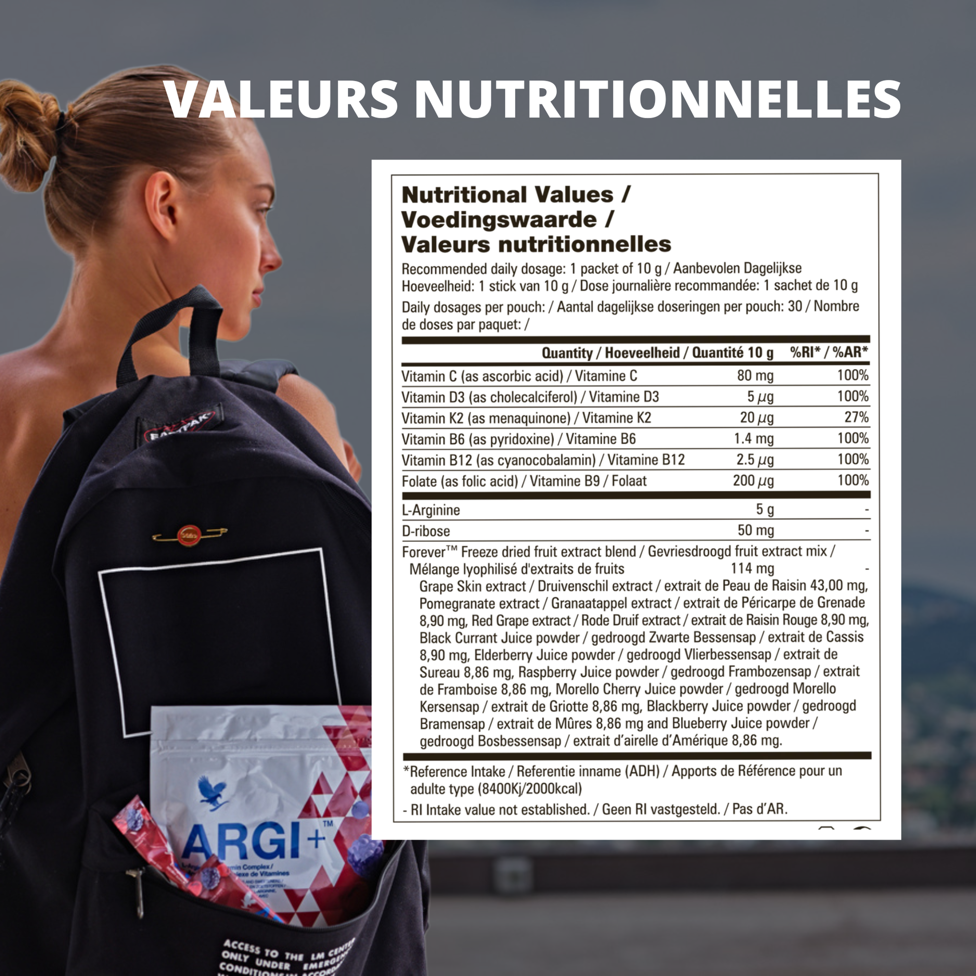 L’ Arginine Argi+. Contient 51 % de L-Arginine, et un mélange d’extraits de fruits rouges. Peau de raisin et de raisin rouge, ainsi que le cassis, la framboise, la cerise, et la mûre.