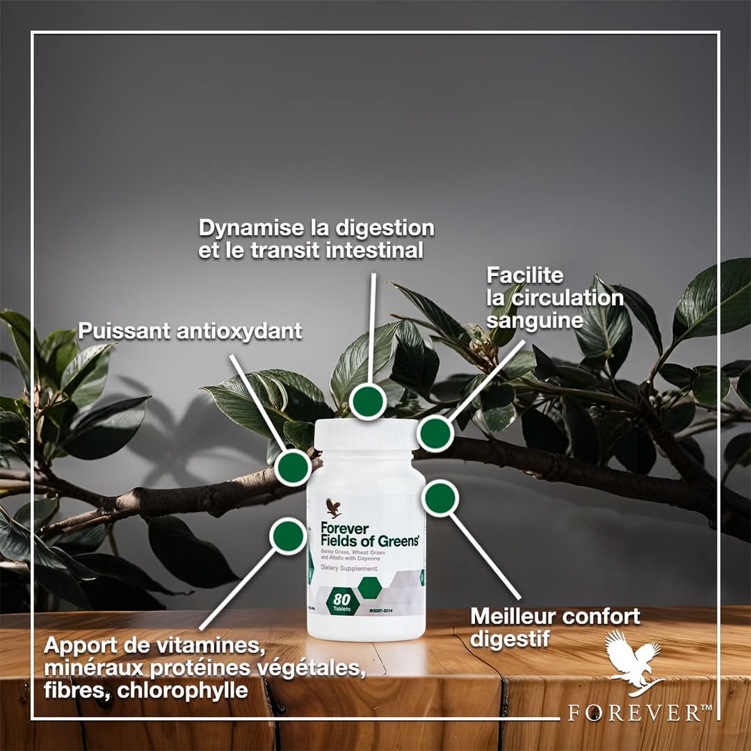 Fields of greens est un mélange de luzerne, d’herbe de blé, et d’herbe d’orge verte bien équilibré.Pour les végétariens, les sportifs et les esprits jeunes, c’est un complément parfait pour son action positive sur notre corps.