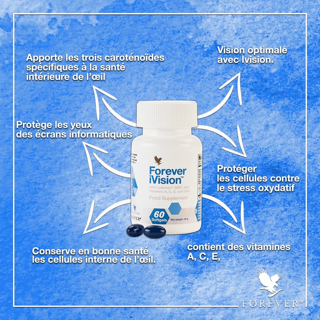 Le Lutemax 2020®, est mondialement reconnu et gagnant du NutrAward en 2018, il est une aide précieuse pour la vision et combine trois caroténoïdes importants (lutéine, zéaxanthine et méso-zéaxanthine) qui ne sont pas fabriqués par notre organisme. Ivision Forever protègent nos yeux du stress oxydatif, provoqué par les sources d’agressions lumineuses de nos écrans informatiques qui nous entourent.