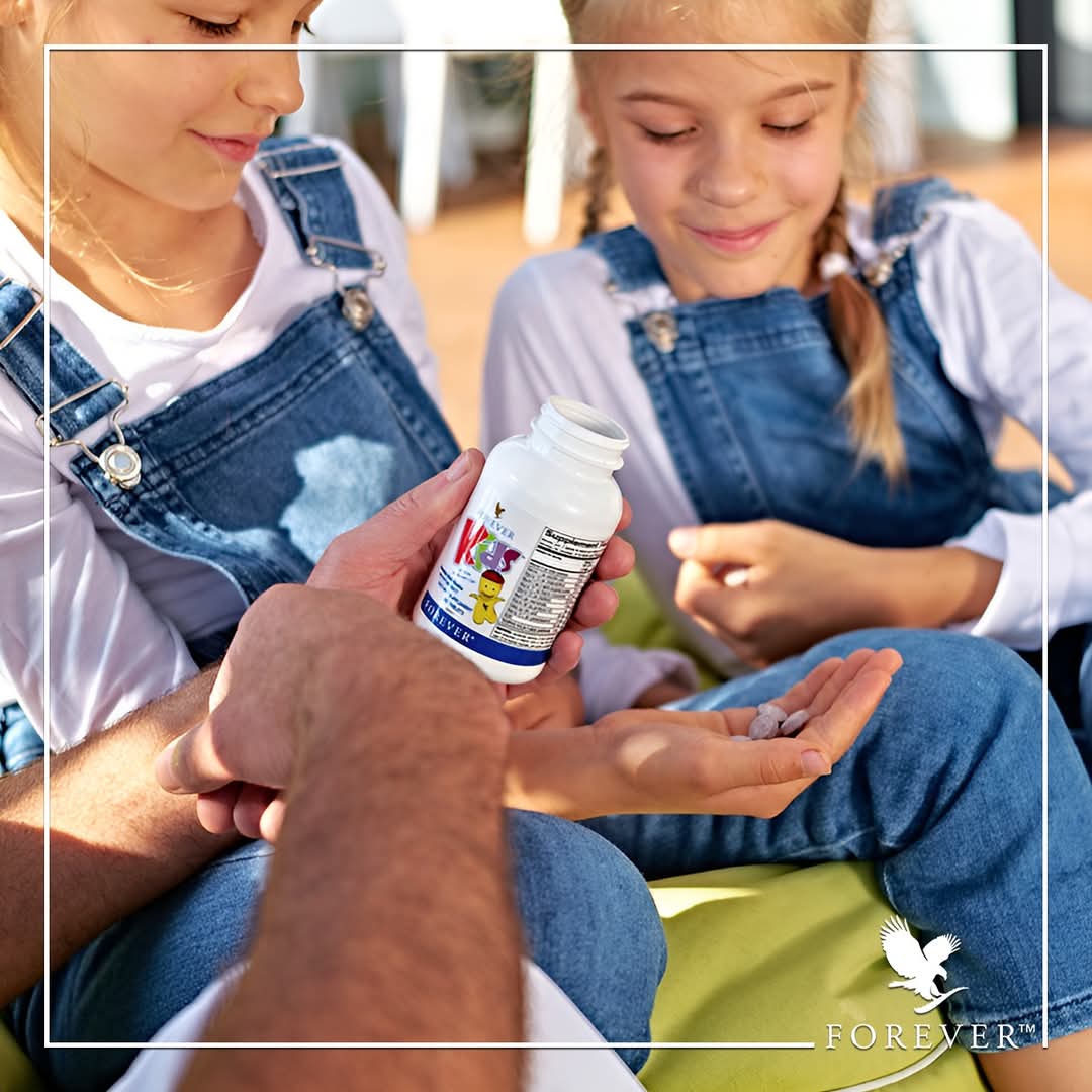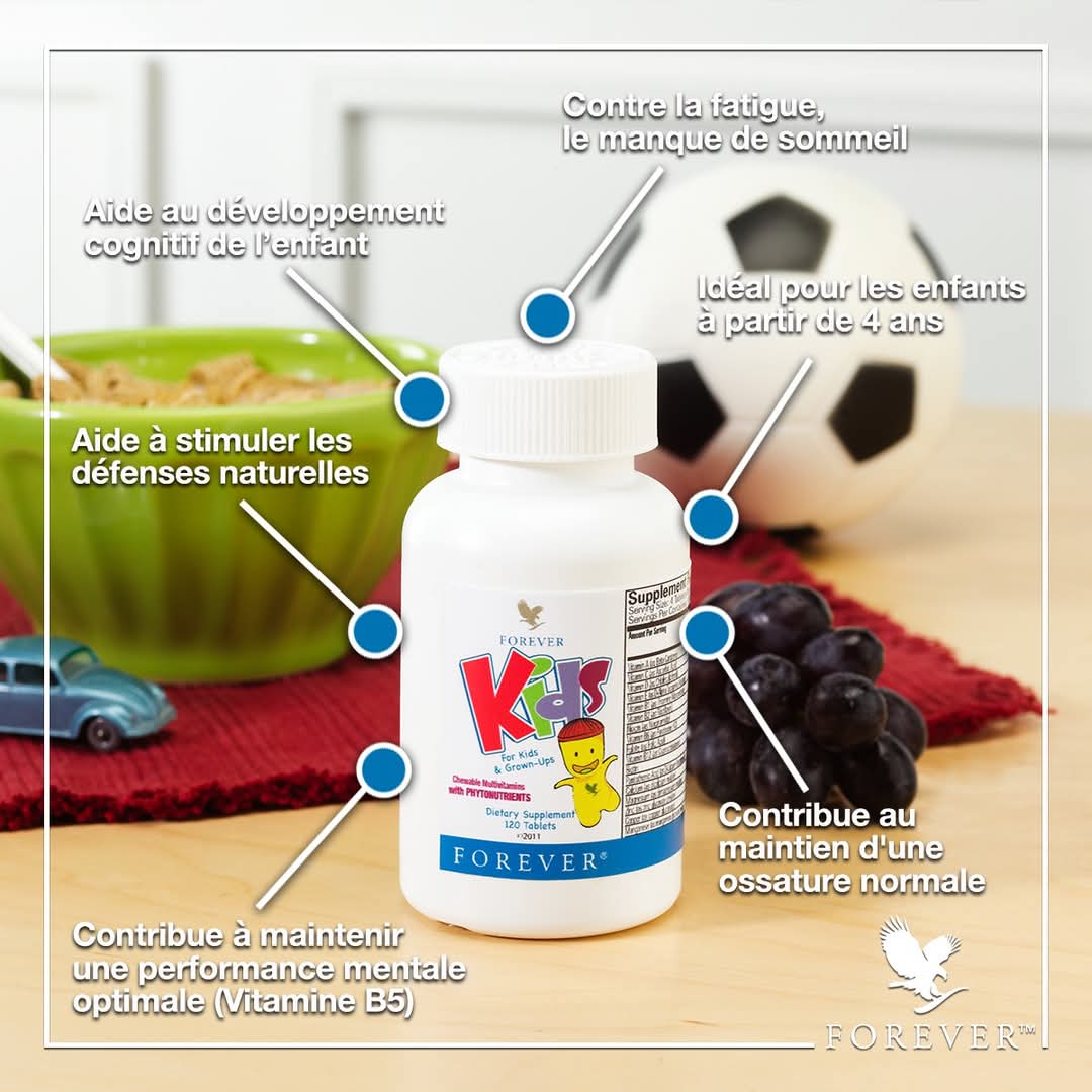 Vitamines enfants kids Forever : conseillées pour les enfants à partir de 4 ans et les jeunes adultes. Sucer ou croquer 4 comprimés dans la journée.