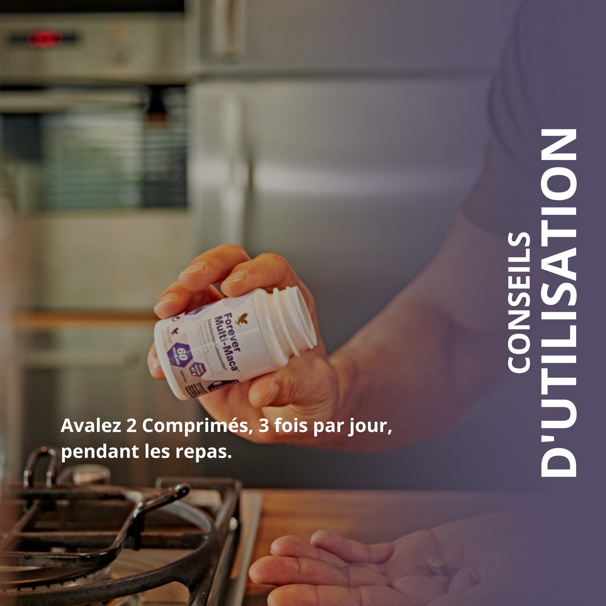 6 comprimés de multi-maca, 2 matin, 2 midi et 2 le soir.