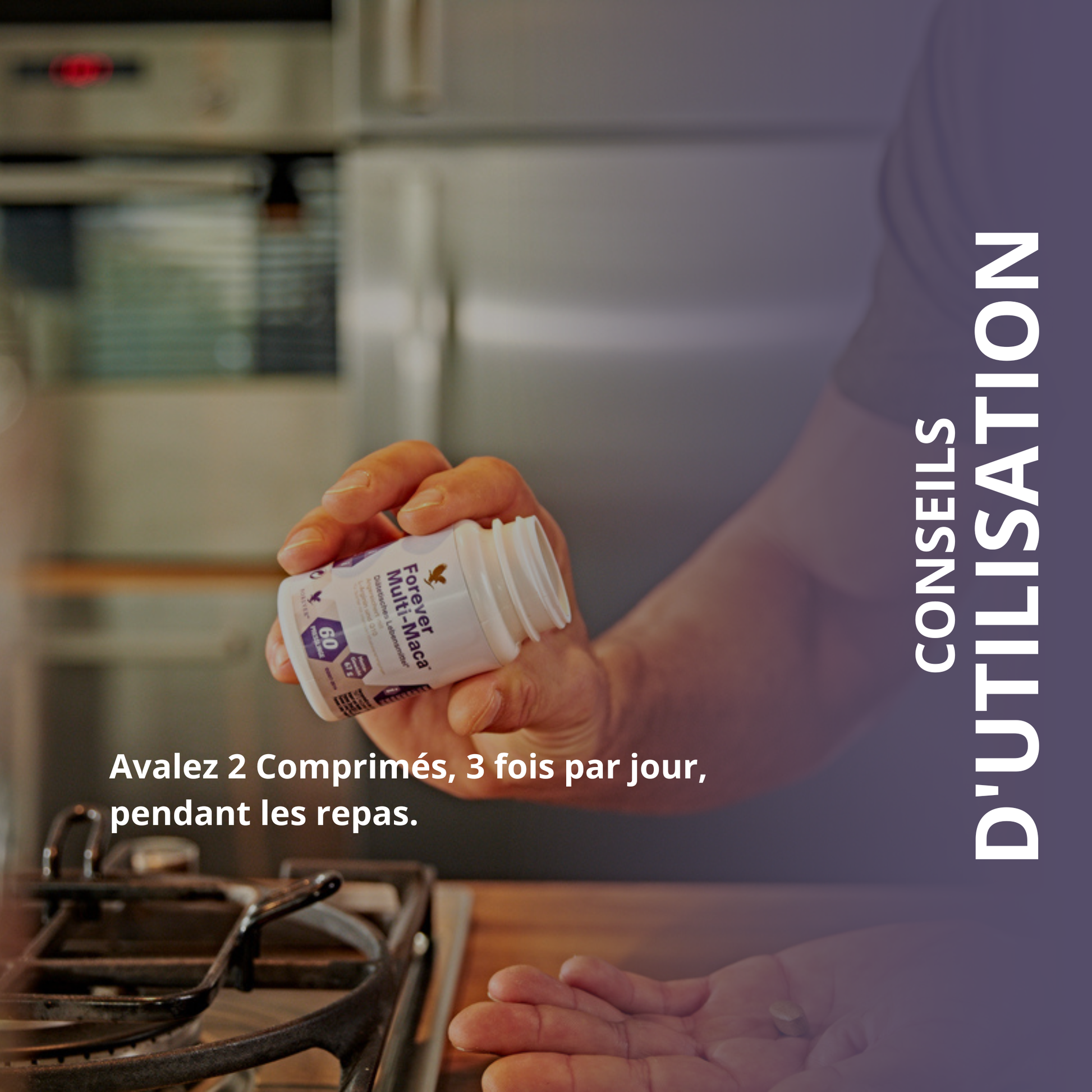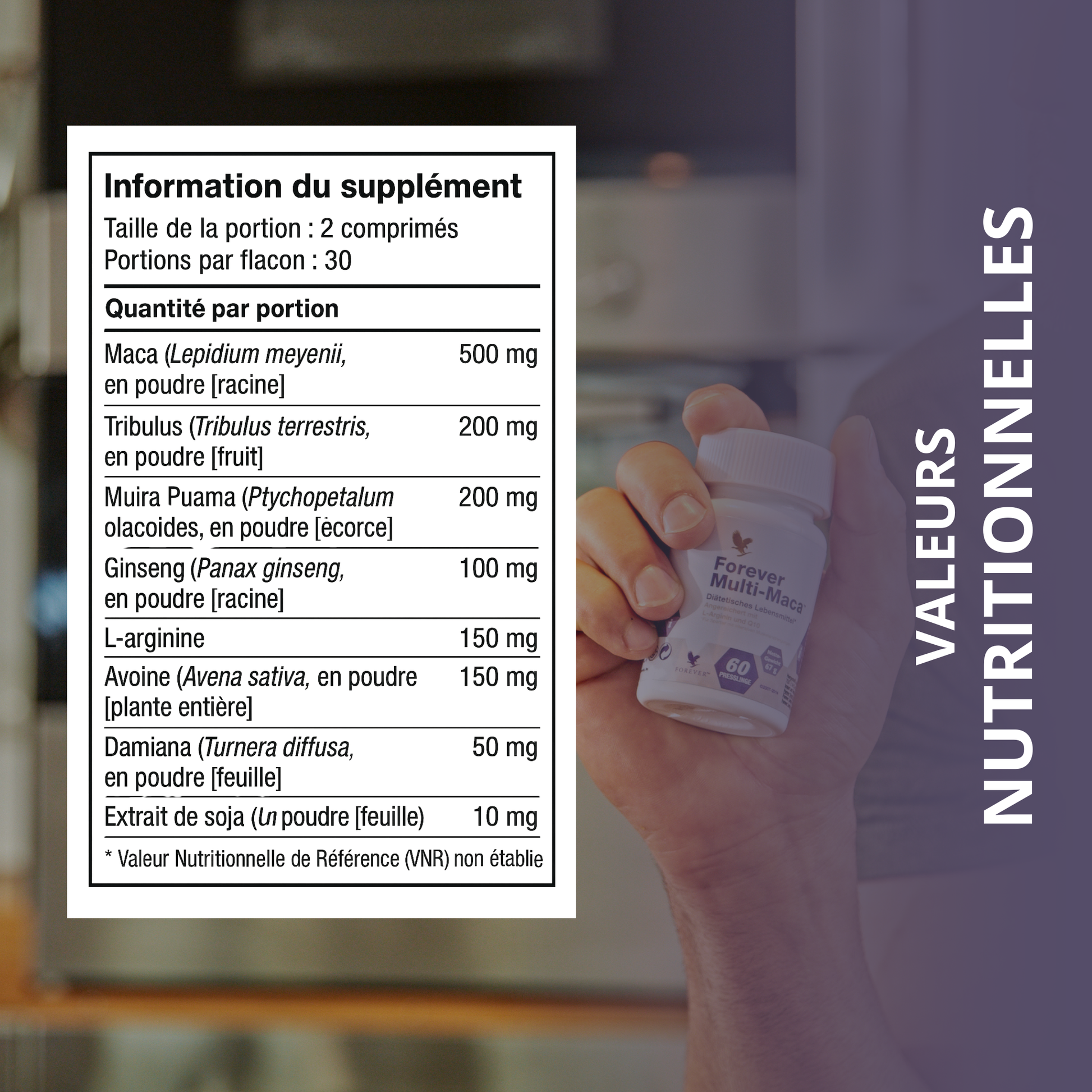 La maca, actif adaptogène dont les tubercules possèdent de très nombreuses propriétés. Ces actifs soutiennent les performances physiques et intellectuelles, qui favorisent l’équilibre hormonal des femmes pendant la ménopause. Forever multi-maca, participe à un confort et une fonction urinaire normale chez les hommes. L action de Multi- maca, stimule et favorise les performances physiques et augmente chez l’homme et la femme, le désir sexuel, le tonus et la libido.