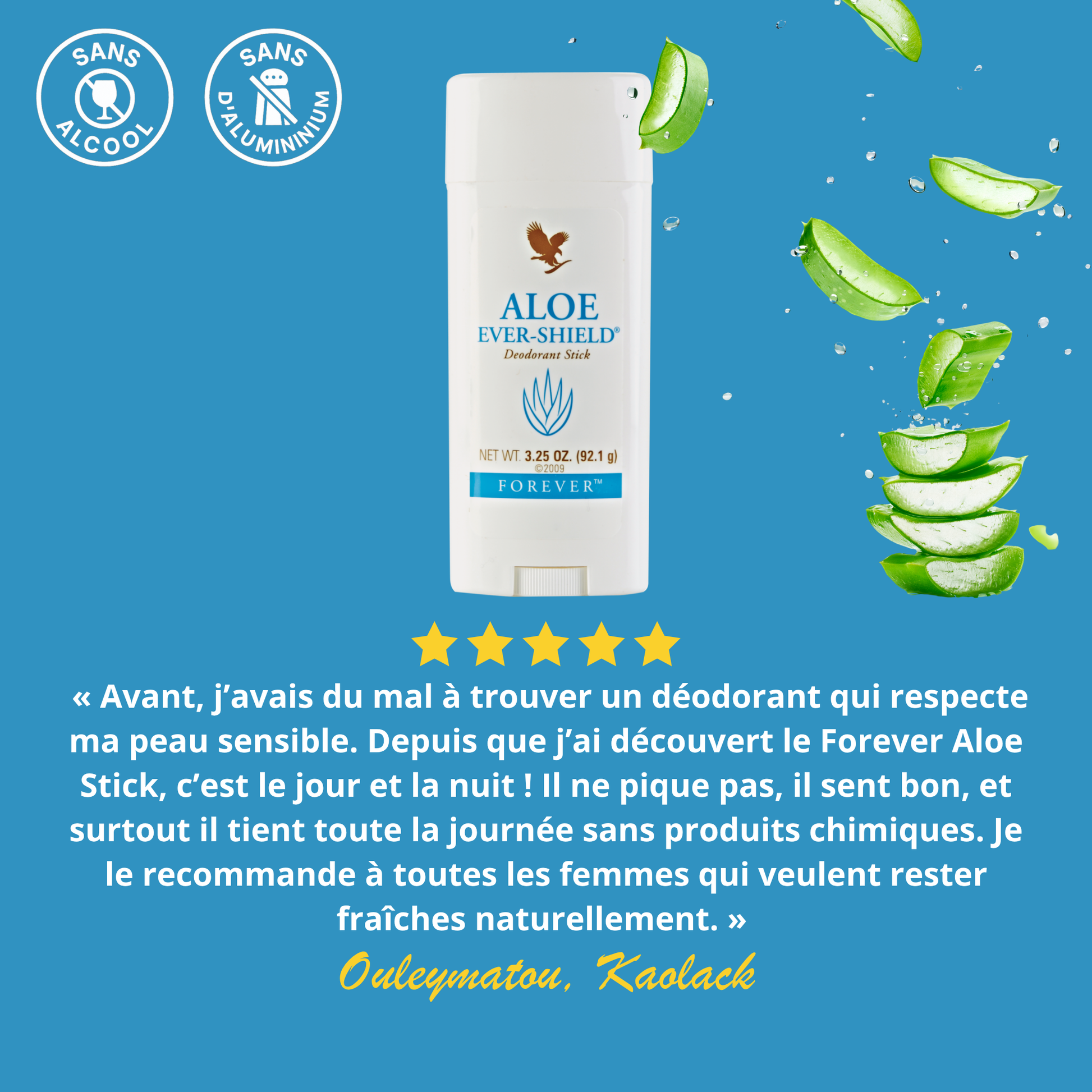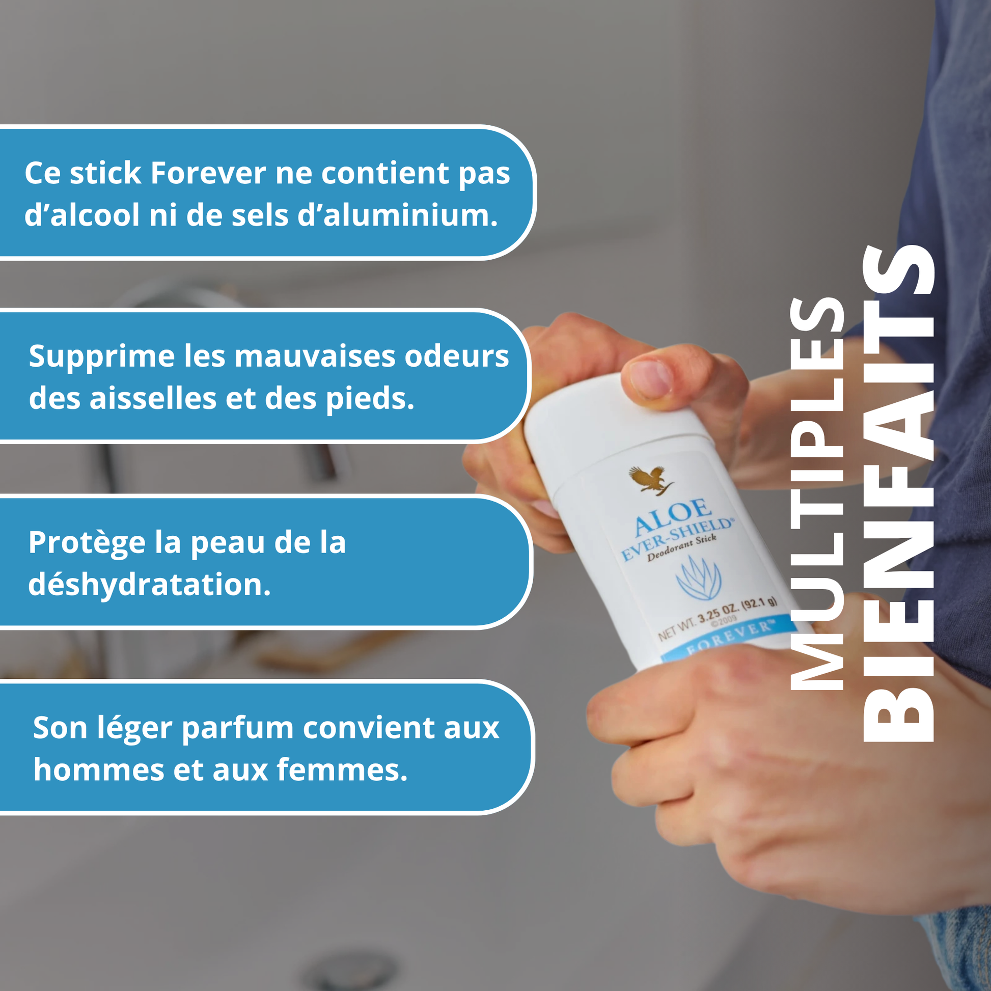 Le stick déodorant aloès Forever, ( Aloe Ever- shield ) supprime le développement des odeurs corporelles indésirables tout en protégeant le peau de la déshydratation. Le corps reste frais tout au long de la journée. Sa formule sans alcool ni sels d’aluminium, ces anti-transpirants nocifs pour la peau ne laisse aucune trace sur les vêtements et ne provoque pas de réaction d’irritation de la peau.
