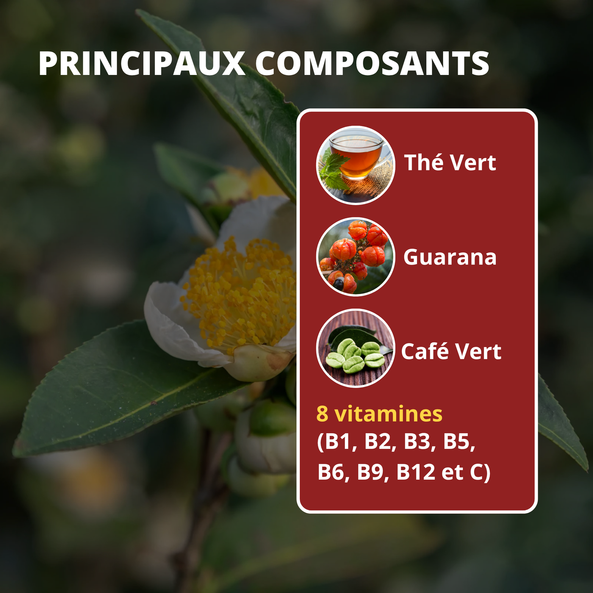 Therm « brûleur de graisses » contient du thé vert, guarana, café vert, 8 vitamines( B1, B2, B3, B5, B6, B9, B12 et C)