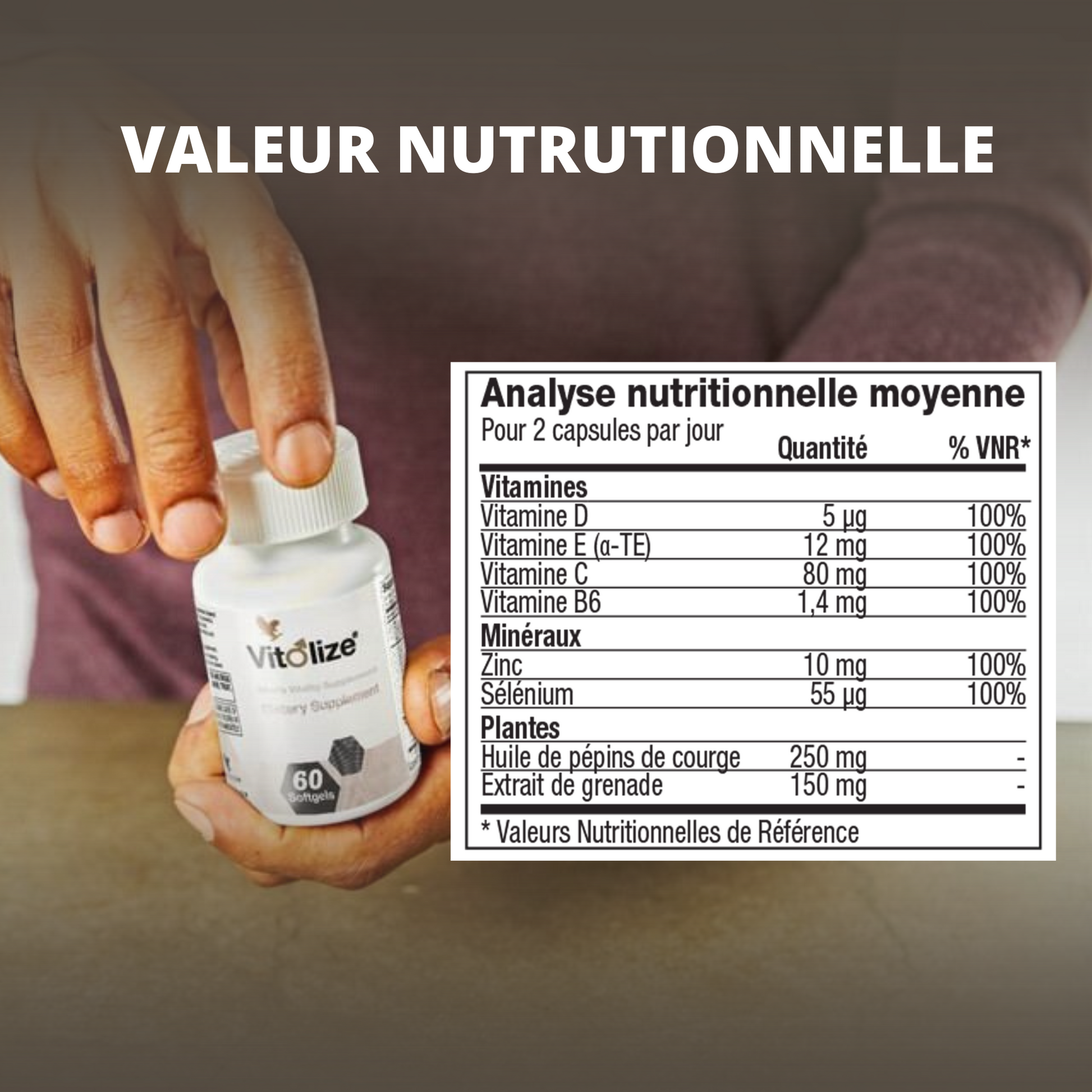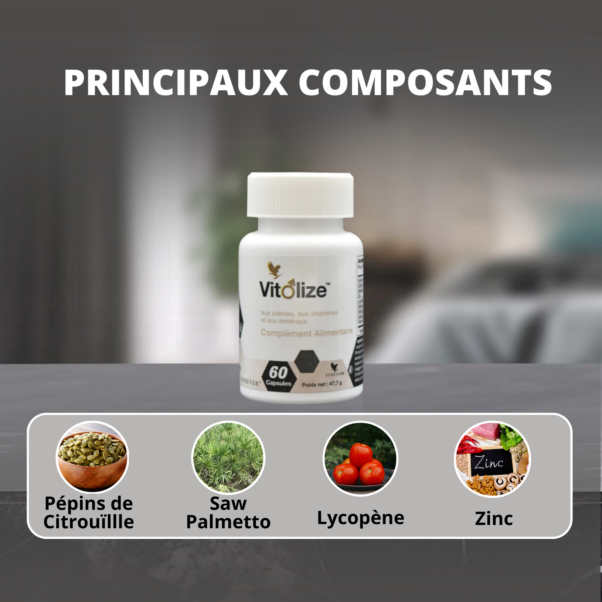 Vitolize Men Forever (homme) contient des vitamines, des minéraux, et des phytostérols, issus de l’huile de pépins de courge qui ont une action permettant de garder un bon fonctionnement de la prostate. Il contribue au maintien de la fertilité, de la reproduction et du taux de testostérone dans le sang. Il rationalise l’activité hormonale et le sélénium aide à une spermatogénèse normale.