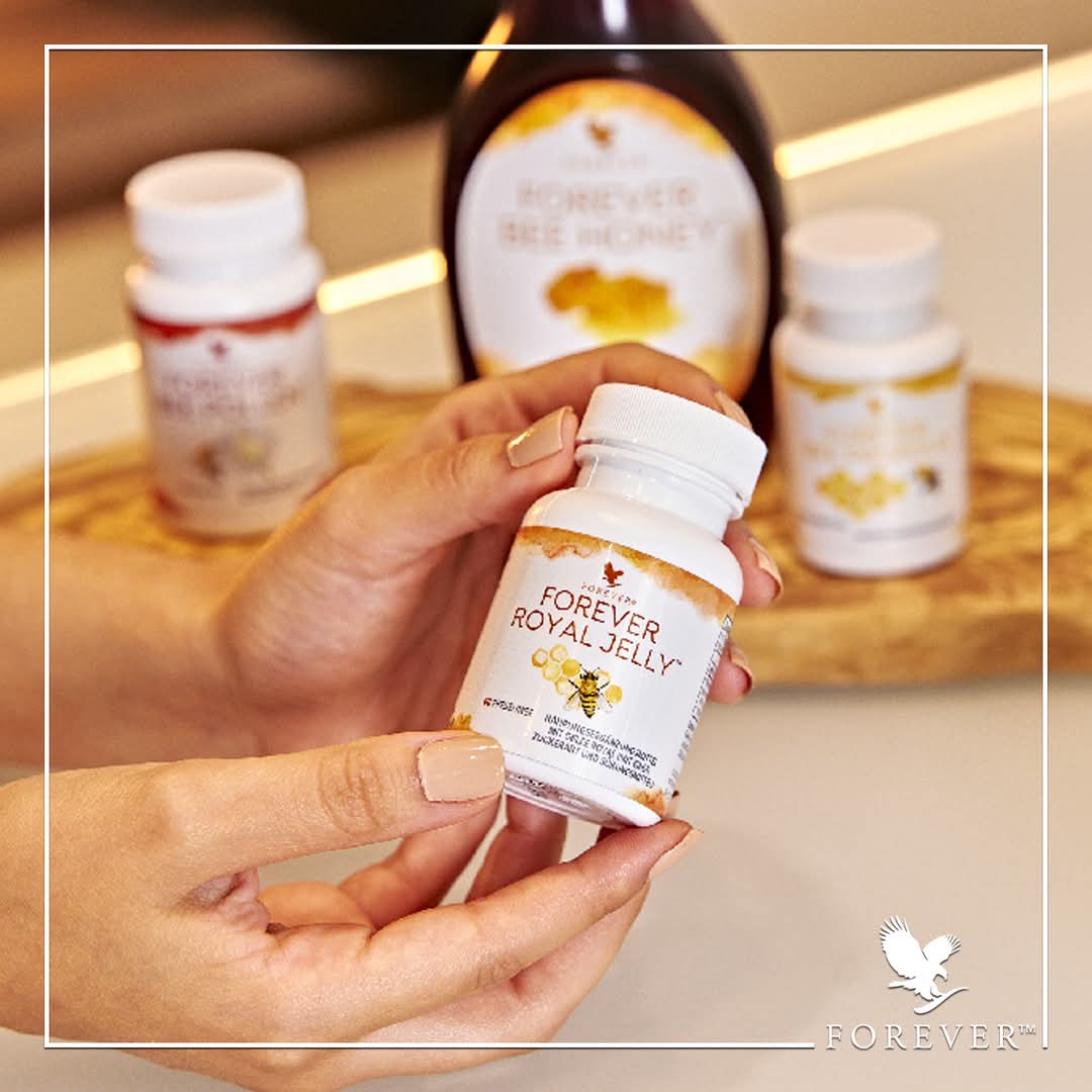 La gelée royale (Forever Royal Jelly) appelée également lait des abeilles, est idéale pour se prémunir contre les conséquences de la période hivernale. Elle contient, des protéines, des sucres, des acides gras qui sont les artissants de la majeure partie des propriétés biologiques de la gelée royale pure. Des minéraux comme (le calcium, le fer, le cuivre, le magnésium, le phosphore, le potassium, le silicium et le sodium) et aussi des vitamines B, B1, B2 ou riboflavine, sont essentielle pour la peau, la vision, et le maintien d’un métabolisme normal. Et enfin, la vitamine B12, qui est une vitamine essentielle pour le bon fonctionnement du cerveau, pour le renouvellement cellulaire et pour les personnes qui suivent un régime végétarien. Et des oligo-éléments.