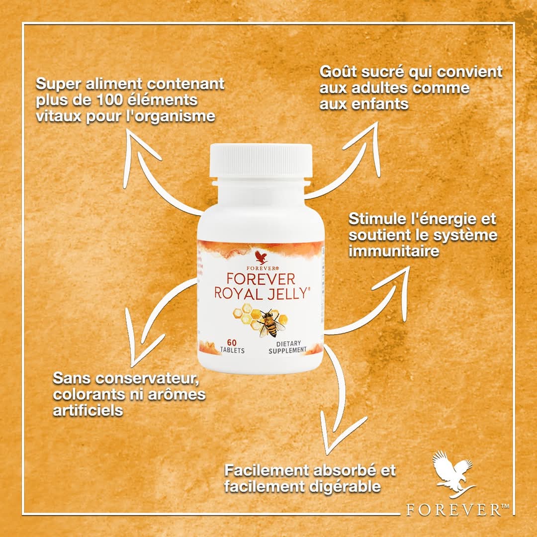 En complément alimentaire, la gelée royale, est utilisée pour réduire les symptômes de la fatigue physique et intellectuelle, le stress. Son action renforce l’immunité de l’organisme, renforce en douceur les défenses naturelles du corps et permet d’attaquer l’hiver en forme. La gelée royale Forever est un cocktail de vie pour notre bien-être.