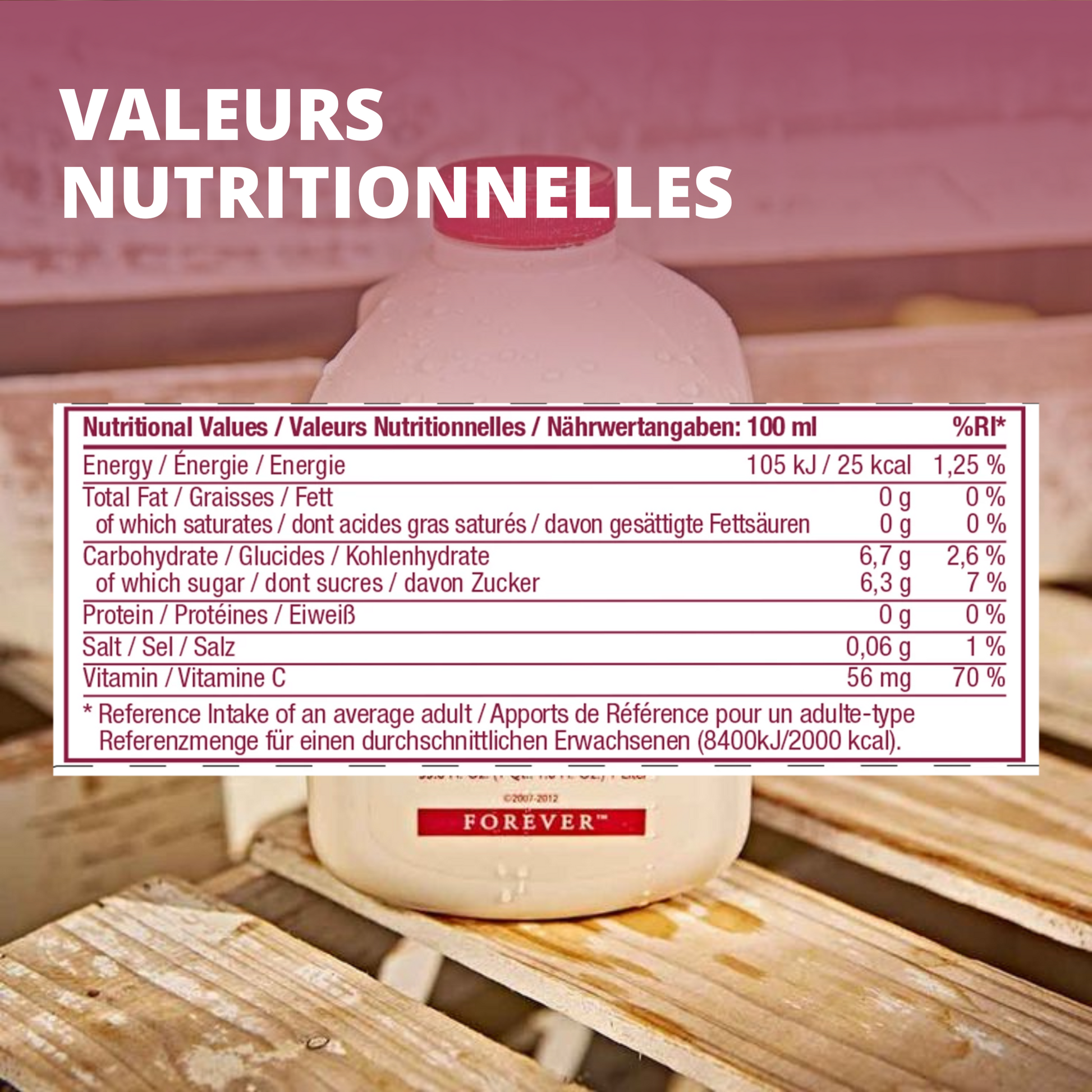 Au goût délicieusement acidulé, Aloe berry nectar Forever, contient de l’extrait de canneberge ou cranberry en anglais « cousine de la myrtille et de l’airelle » qui est un désinfectant des voies urinaires et qui bloque le développement des germes pathogènes. Très riche en vitamine C. Celle-ci est recommandée aux sportifs parce qu’elle compense les pertes de zinc et de magnésium pendant l’effort au cours des exercices. Associé à la pulpe d’aloe vera stabilisée buvable, qui possède des antioxydants qui piègent les radicaux libres. Les antioxydant contenus dans la pomme contribuerait à réduire le risque de maladies cardiovasculaires. La pomme qui contient des antioxydants qui aideraient à diminuer et à prévenir l’oxydation des lipides en circulation dans le sang. Avec l’association de ces trois éléments, Gelée aloe vera stabilisée, canneberge et pomme. Aloe berry nectar est un très bon produit Forever pour la santé.