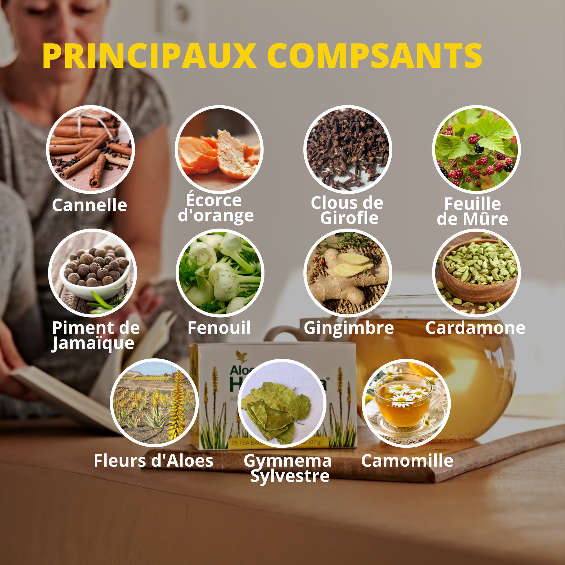 Cette boisson ( Aloe Blossom Herbal Tea ) allie des ingrédients soigneusement sélectionnés provenant de Jamaïque, d’Égypte, d’Amérique, de Chine et d’Inde. L’arôme subtil et délicat associe les goûts acidulés de l’écorce d’orange et de citron. l’infusion fleur d’aloès avec ses saveurs épicés de la cannelle et du clou de girofle, la fraîcheur du poivre de Jamaïque et du gingembre. L’action de cette infusion fleur d’aloès Forever permet de drainer et d’éliminer autant qu’elle contribue à la digestion et à la détente grâce aux dix fruits et extraits de plantes qui ont été associés aux fleurs. L’infusion fleur d’aloès apporte un bien être digestif et réhydrate en douceur l’organisme.