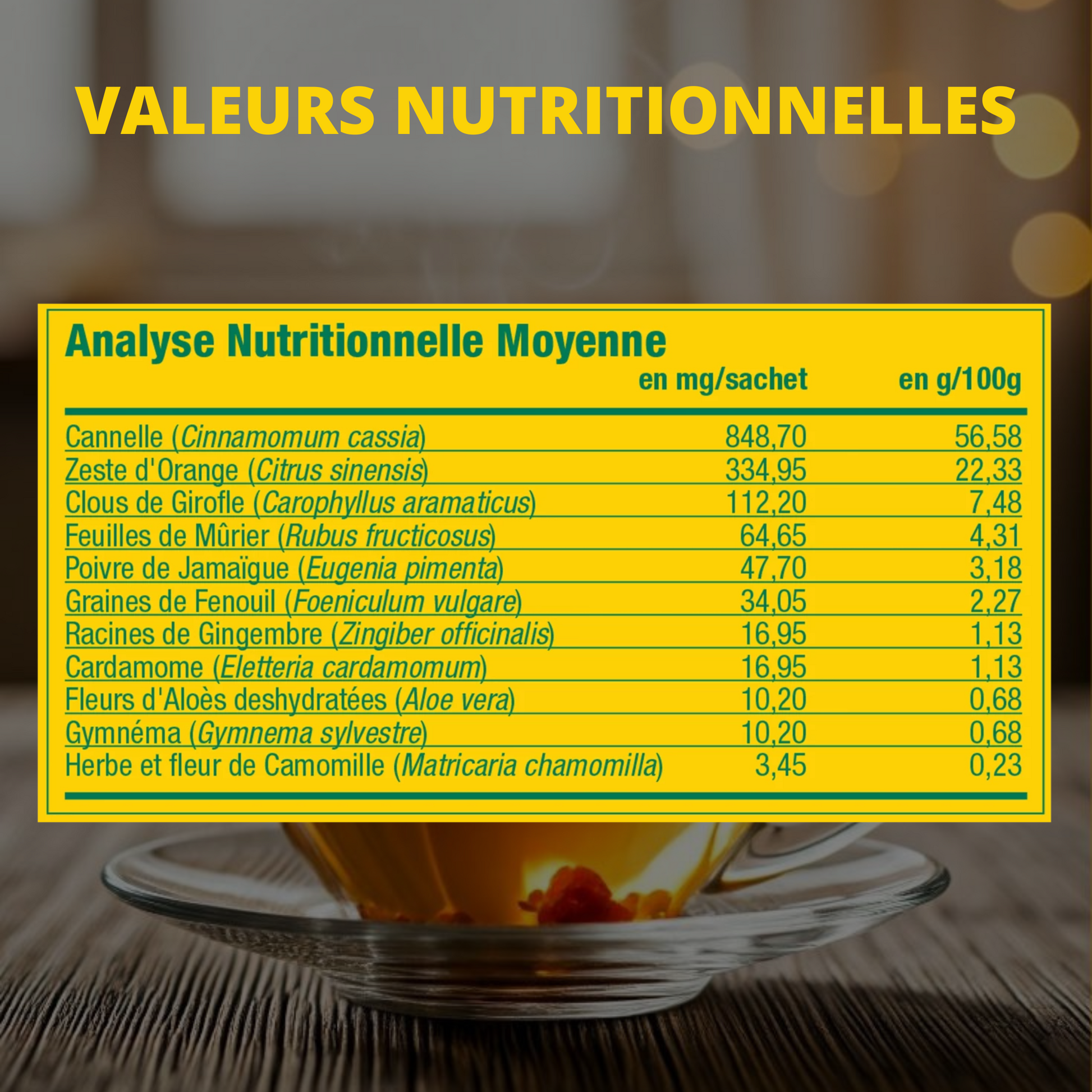 Bâton de Cannelle (Cinnamomum cassia), zeste d’Orange (Citrus sinensis), clous de Girofle (Carophyllus aromaticus), feuilles de Mûrier (Rubus fructicosus), poivre de Jamaïque (Eugenia pimenta), graines de Fenouil (Foeniculum vulgare), racine de Gingembre (Zingiber officinale), graine de Cardamome (Eletteria cardamomum), fleurs d’Aloès déshydratées, feuilles de Gymnéma (Gymnema sylvestre) , herbes et fleurs de Camomille (Matricaria chamomilla).